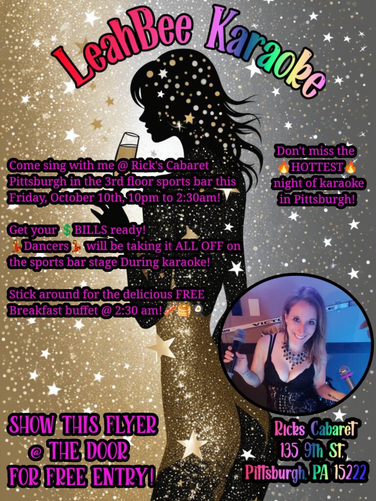 Show the flyer below for FREE ENTRY to Rick’s Cabaret Pittsburgh, Friday, October 10th during karaoke, 10pm to 2:30am!